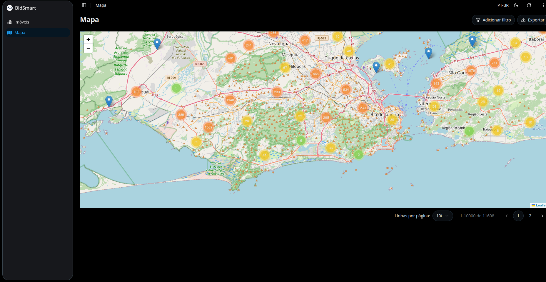 Encontre oportunidades usando busca avançada em mapa com filtros de densidade e mapas de calor por região.
